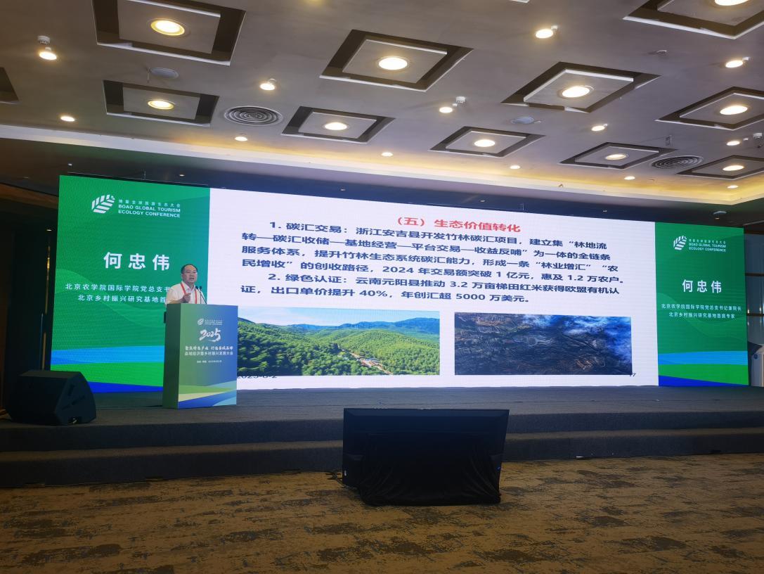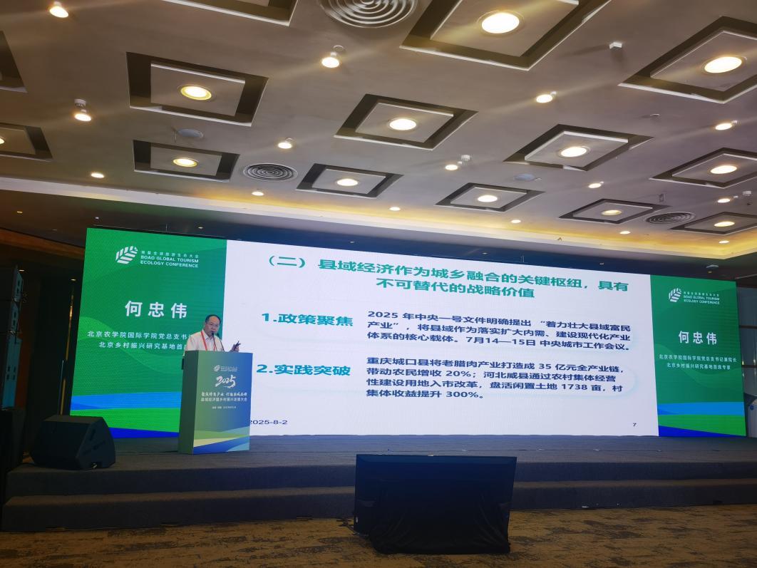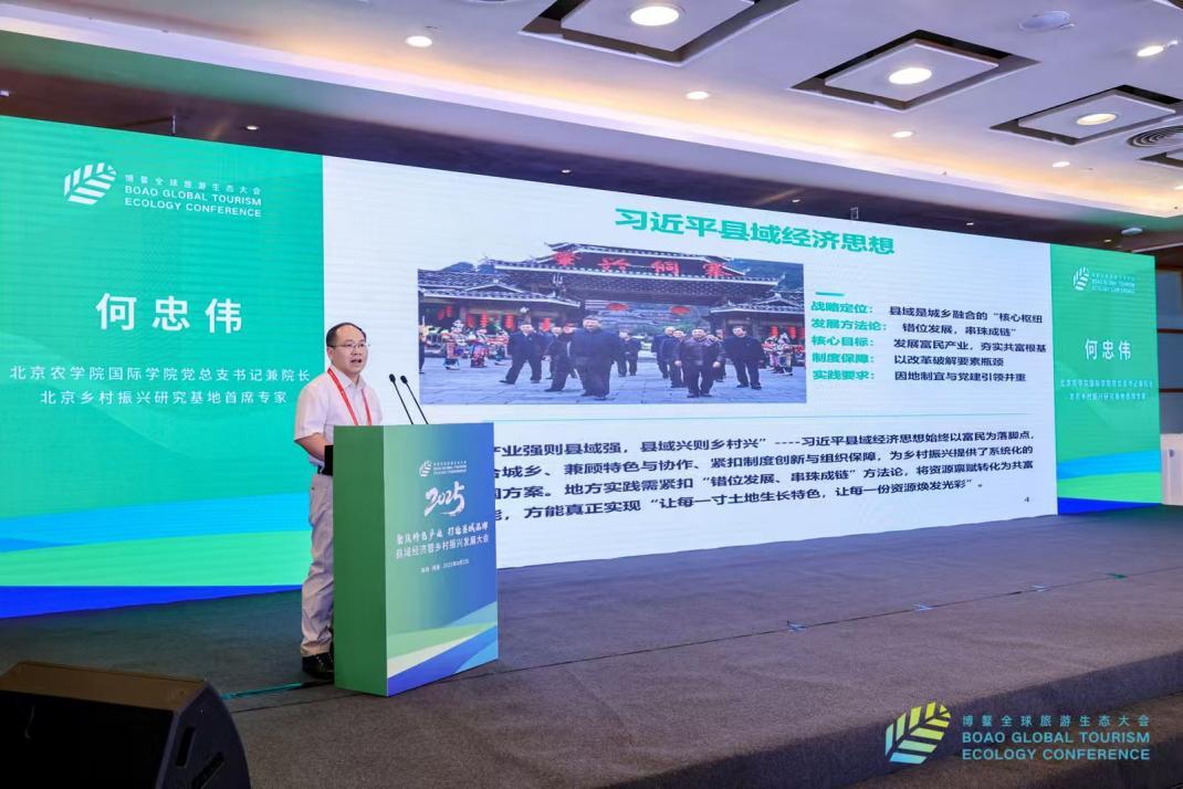 2025年8月2日北京乡村振兴研究基地首席专家何忠伟教授应邀出席在海南博鳌举办的“全球旅游生态大会暨县域经济与乡村振兴发展大会”,并在大会上作“破局与突围:如何借力县域经济打造乡村振兴特色增长极”的学术报告。报告主要观点如下: